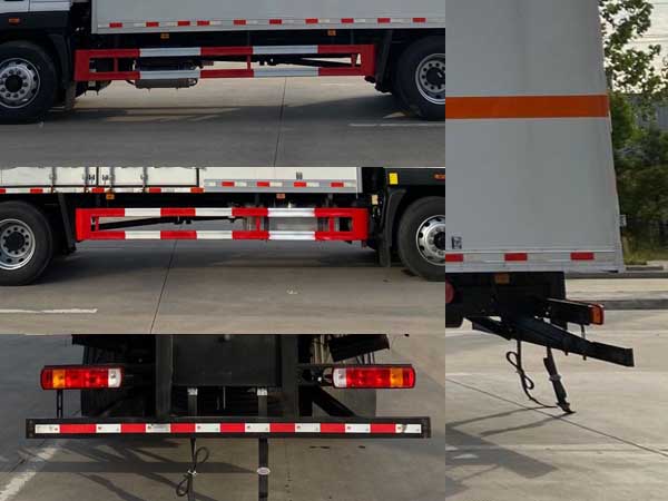 其它 | ABS型號:ABS-E,ABS/ASR-24V-4S/4M,CM4XL-4S/4M,3550D-1010;ABS生產(chǎn)企業(yè):威伯科汽車控制系統(tǒng)(中國)有限公司,東科克諾爾商用車制動系統(tǒng)(十堰)有限公司,廣州瑞立科密汽車電子股份有限公司,東科克諾爾商用車制動系統(tǒng)(十堰)有限公司;安裝有限速裝置;限速裝置限速(km/h):80;安裝有具有衛(wèi)星定位功能的行駛記錄儀;選裝描述:選裝側(cè)門型式及位置,選裝側(cè)門數(shù)量,選裝不開側(cè)門,廂體側(cè)面板選裝開百葉窗,選裝瓦楞板結(jié)構(gòu).該車型可選裝ETC車載裝置;發(fā)動機/油耗值(L/100km)對應關(guān)系為:F4.5NS6B220/24.4,B6.2NS6B210/26;側(cè)后防護情況:側(cè)、后防護材料均為Q235,螺栓連接,后防護截面尺寸120×70mm,下邊緣離地高450mm;車廂頂部封閉且不可開啟;運輸獨立容器(瓶)包裝的貨物;危險貨物類項號:第3類;其他說明:僅選用排氣管前置、前輪盤式制動及子午線輪胎的底盤.該車轉(zhuǎn)向輪安裝輪胎爆胎應急防護裝置,后軸采用空氣懸架.該車為危險貨物運輸車。選裝后尾板時,后防護材料為Q235,焊接,截面尺寸120×50mm,下邊緣離地高450mm。尾板收起狀態(tài)水平長度為290mm,尾板質(zhì)量為550kg。隨底盤選裝駕駛室;選裝燃油箱,電瓶,尿素罐,后處理,儲氣筒左右安裝位置。 | ||